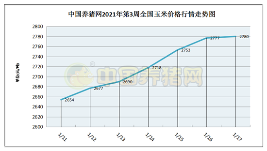 猪价系统数据监测,2021年第3周(2021年01月11日至2021年01月17日)我国玉米价格稳步上涨,价格水平屡破新高。全周玉米价格区间在2654-2780元/吨,周初玉米价格为2654元/吨,周末价格为2780元/吨,全周玉米价格累计上涨了126元/吨。