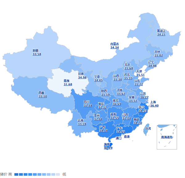 具体来看部分地区的生猪价格,天津市今日生猪(外三元)价格为17.75元/斤,内蒙古自治区价格为17.17元/斤,上海市价格为18.20元/斤,浙江省价格为19.26元/斤,江苏省价格为18.11元/斤,河南省价格为17.83元/斤,湖南省价格为18.77元/斤,广东省价格为19.32元/斤,贵州省价格为18.52元/斤,宁夏回族自治区的价格为17.22元/斤。
