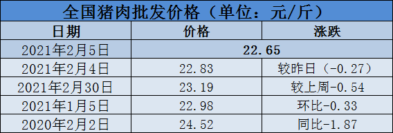 相较昨日(2021年02月04日)22.83元/斤,价格下跌0.27元/斤;