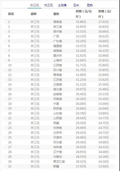 外三元价格排行榜”上更是能够看出近期猪价跨跌严重,往期猪价高达40元/公斤,大部分地区猪价在36元/公斤情况不在。反而半数地区猪价在30元/公斤以下,猪市情况不妙,