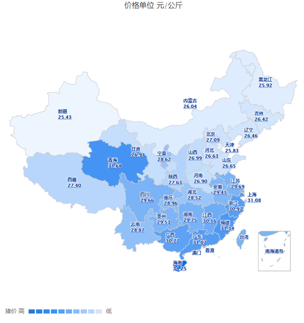 具体来看部分省/市/地区的生猪价格,新疆维吾尔自治区今日生猪(外三元)价格为25.43元/公斤,上海市的价格为31.08元/公斤,山西省的价格为26.99元/公斤,内蒙古自治区的价格为26.04元/公斤,广东省的价格为31.07元/公斤,江西省的价格为30.16元/公斤,福建省的价格为31.34元/公斤,海南省的价格为34.25元/公斤,云南省的价格为28.87元/公斤,贵州省的价格为29.53元/公斤。
