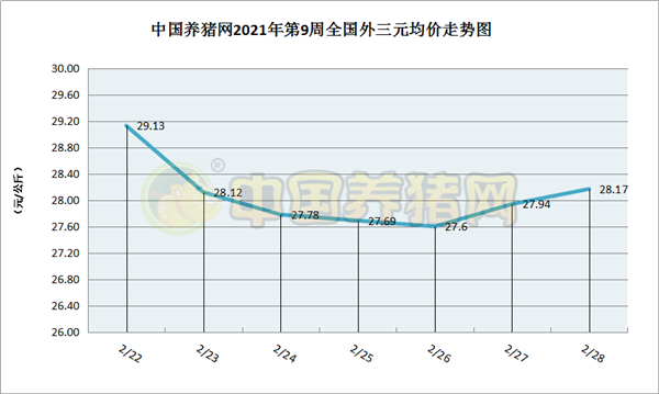 猪价系统数据监测,2021年第9周(2021年02月22日至2021年02月28日)全国外三元生猪价格走势为前期走跌,到了中期价格企稳,后期又转而上涨。本周猪价区间在27.60-29.13元/公斤之间!周初猪价为29.13元/公斤,周末猪价为28.17元/公斤,全周猪价累计下跌了0.96元/公斤。