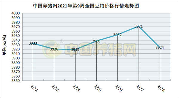 猪价系统数据监测,2021年第9周(2021年02月22日至2021年02月28日)本周豆粕价格呈现“跌-涨-跌”走势。全周豆粕价格区间在3919-3971元/吨之间,周初豆粕价格为3933元/吨,周末价格为3924元/吨,全周豆粕价格累计下跌了9元/吨。