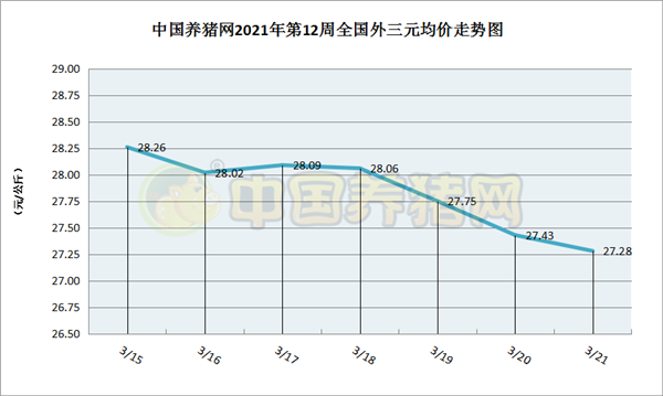 猪价系统数据监测,2021年第12周(2021年03月15日至2021年03月21日)全国外三元生猪价格直线下滑,中间小有反弹上涨又转为下跌。本周猪价区间在27.28-28.26元/公斤之间!周初猪价为28.26元/公斤,周末猪价为27.28元/公斤,全周猪价累计下跌了0.98元/公斤。