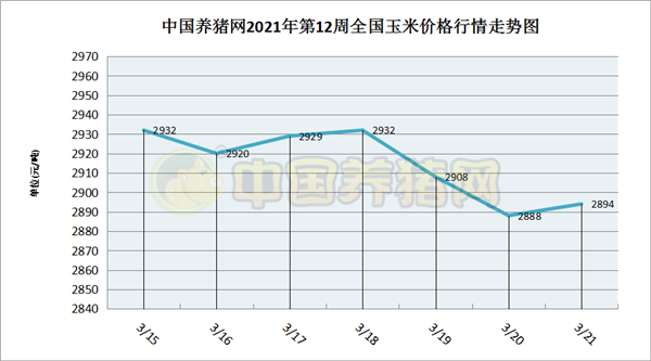猪价系统数据监测,2021年第12周(2021年03月15日至2021年03月21日)我国玉米价格涨跌互现,但总体仍是下跌走势。全周玉米价格区间在2888-2932元/吨,周初玉米价格为2932元/吨,周末价格为2894元/吨,全周玉米价格累计下跌了38元/吨。