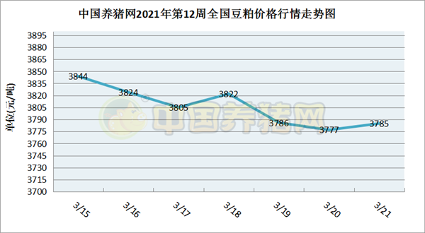 猪价系统数据监测,2021年第12周(2021年03月15日至2021年03月21日)本周豆粕价格呈现“跌-涨-跌”走势,后期有企稳走势。全周豆粕价格区间在3777-3844元/吨之间,周初豆粕价格为3844元/吨,周末价格为3785元/吨,全周豆粕价格累计下跌了59元/吨。
