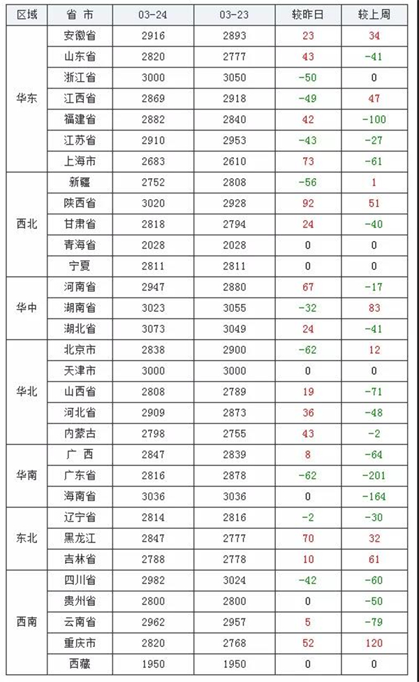 上涨地区(16个):安徽省、山东省、福建省、上海市、陕西省、甘肃省、河南省、湖北省、山西省、河北省、内蒙古自治区、广西壮族自治区、黑龙江省、吉林省、云南省、重庆市;