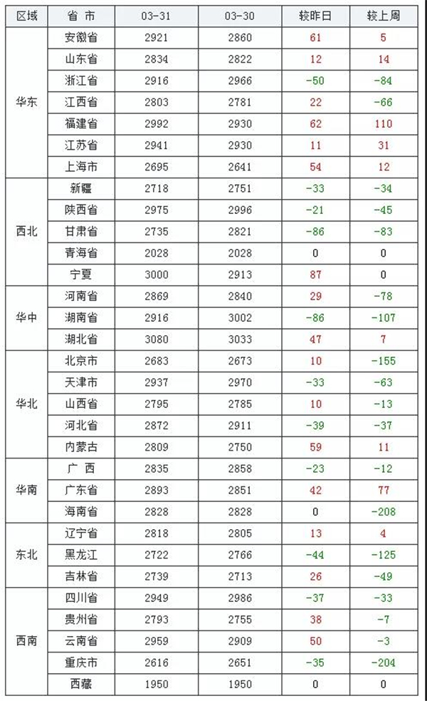上涨地区(17个):安徽省、山东省、江西省、福建省、江苏省、上海市、宁夏回族自治区、河南省、湖北省、北京市、山西省、内蒙古自治区、广东省、辽宁省、吉林省、贵州省、云南省;