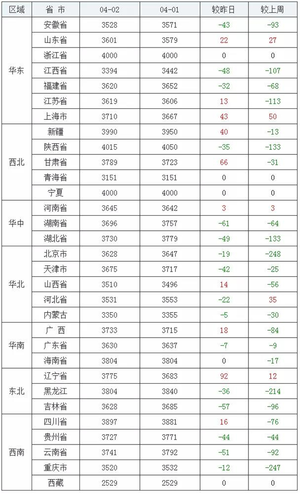 下跌地区(12个):安徽省、江西省、福建省、陕西省、湖南省、湖北省、北京市、天津市、河北省、内蒙古自治区、广东省、黑龙江省、吉林省、贵州省、云南省、重庆市;跌幅为5-61元/吨。