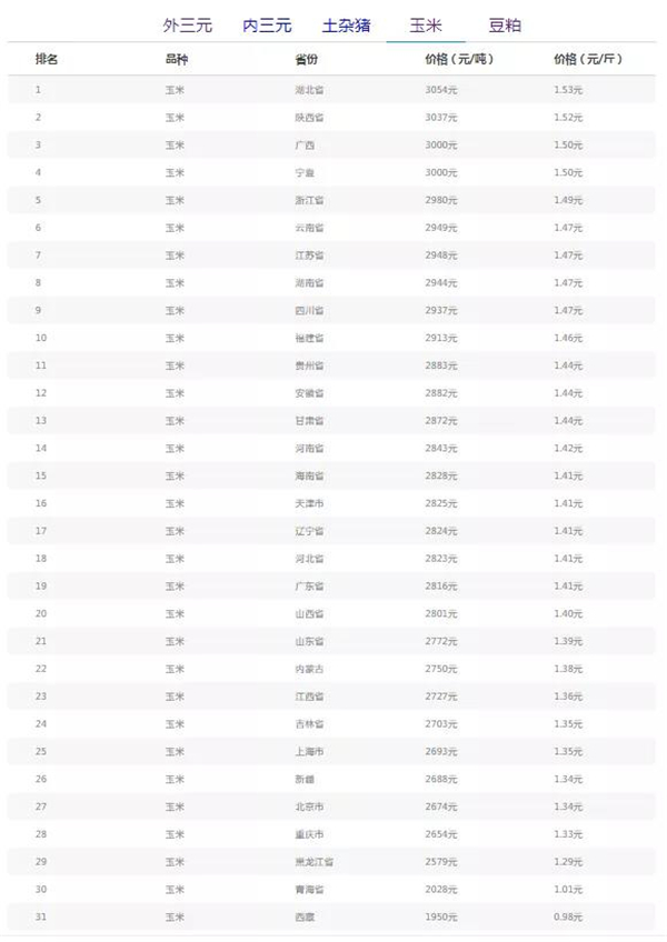 玉米均价(饲料原料)各地区最高: