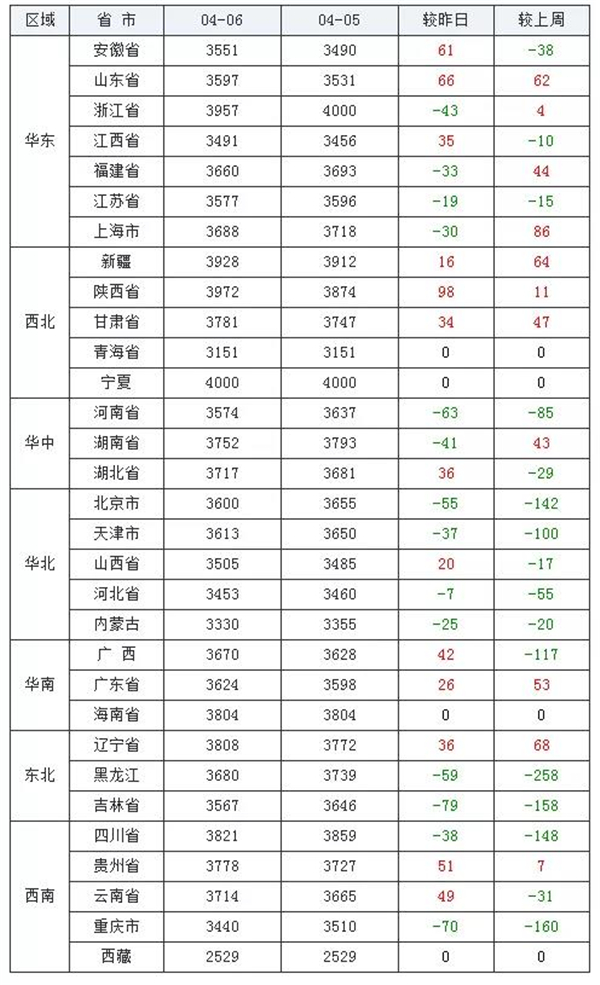 下跌地区(14个):浙江省、福建省、江苏省、上海市、河南省、湖南省、北京市、天津市、河北省、内蒙古自治区、黑龙江省、吉林省、四川省、重庆市;跌幅为7-79元/吨。