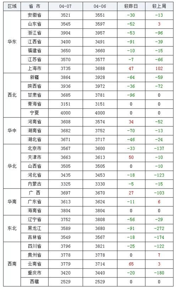 下跌地区(20个):安徽省、山东省、浙江省、江西省、福建省、江苏省、新疆维吾尔自治区、陕西省、甘肃省、湖南省、湖北省、北京市、河北省、内蒙古自治区、广东省、辽宁省、黑龙江省、吉林省、四川省、重庆市;跌幅为5-96元/吨。