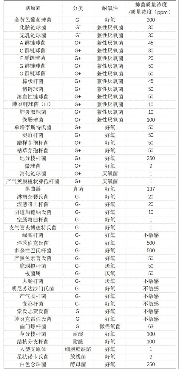 在临床应用方面,月桂酸单甘酯的使用剂量应该如何掌握呢?月桂酸单甘酯是食品乳化剂兼防腐剂,在食品工业上,是GRAS(Generally Recognized as Safe)级别,添加量不受限制。月桂酸单甘酯易溶于热水,但在冷水中溶解度约为20 ppm,体外抑菌试验表明,其在很低的剂量下就可以发挥抑菌作用(表1)。