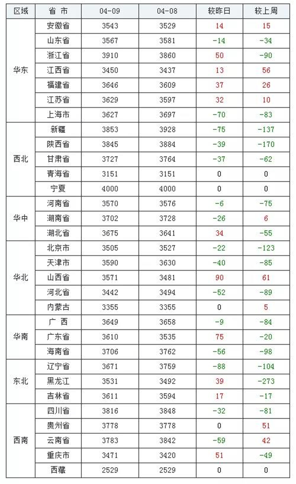 下跌地区(15个):山东省、上海市、新疆维吾尔自治区、陕西省、甘肃省、河南省、湖南省、北京市、天津市、河北省、广西壮族自治区、海南省、辽宁省、四川省、云南省;跌幅为9-88元/吨。