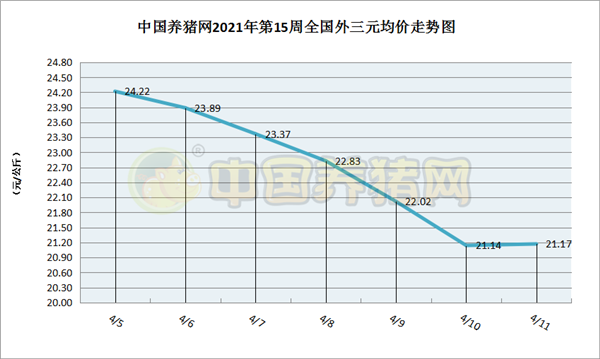 猪价系统数据监测,2021年第15周(2021年4月5日至2021年04月11日)全国外三元生猪价格前、中期“滑铁卢”走跌,后期转稳。本周猪价区间在21.14-24.22元/公斤之间!周初猪价为24.22元/公斤,周末猪价为21.17元/公斤,全周猪价累计下跌了3.05元/公斤。