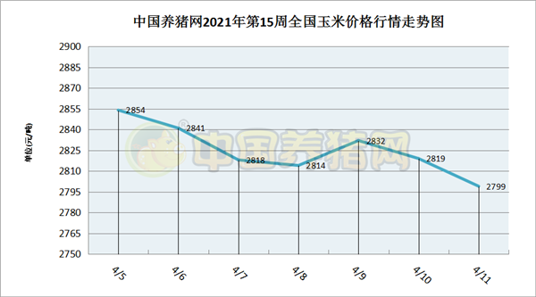 猪价系统数据监测,2021年第15周(2021年4月5日至2021年04月11日)我国玉米价格呈现“跌-涨-跌”走势,前期直线走跌,中期小幅反弹,后期又急转直下。全周玉米价格区间在2799-2854元/吨,周初玉米价格为2854元/吨,周末价格为2799元/吨,全周玉米价格累计下跌了55元/吨。