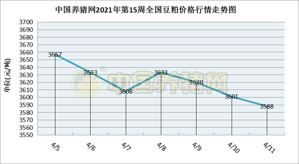 猪价系统数据监测,2021年第15周(2021年4月5日至2021年04月11日)本周豆粕价格小幅下滑,中期小幅度反弹。全周豆粕价格区间在3588-3657元/吨之间,周初豆粕价格为3657元/吨,周末价格为3588元/吨,全周豆粕价格累计下跌了69元/吨。