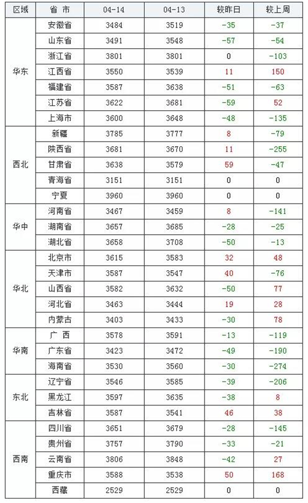下跌地区(17个):安徽省、山东省、福建省、江苏省、上海市、湖南省、湖北省、山西省、内蒙古自治区、广西壮族自治区、广东省、海南省、辽宁省、黑龙江省、四川省、贵州省、云南省;跌幅为13元-59元/吨。