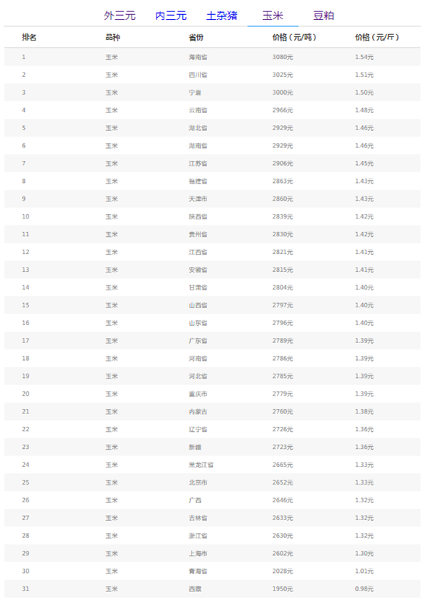 2021年04月15日(星期四),今日全国玉米均价为2804元/吨,报价较昨日下跌了6元/吨,环比下跌4.37%,同比上涨38.13%。