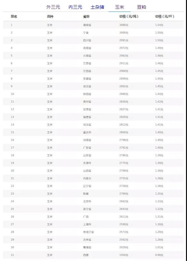 玉米均价(饲料原料)各地区最高:
