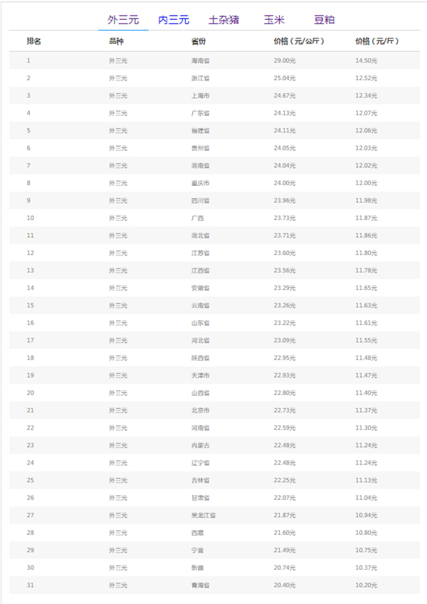 外三元排行前三:海南省29.00/公斤、浙江省25.04元/公斤、上海市24.67元/公斤。