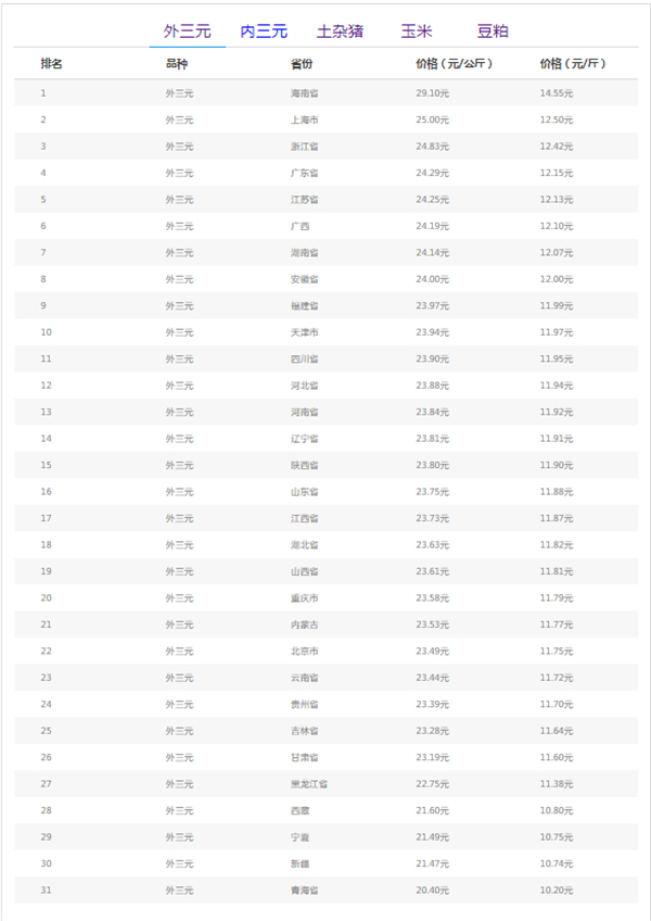 外三元排行前三:海南省29.10/公斤、上海市25.00元/公斤、浙江省24.83元/公斤。