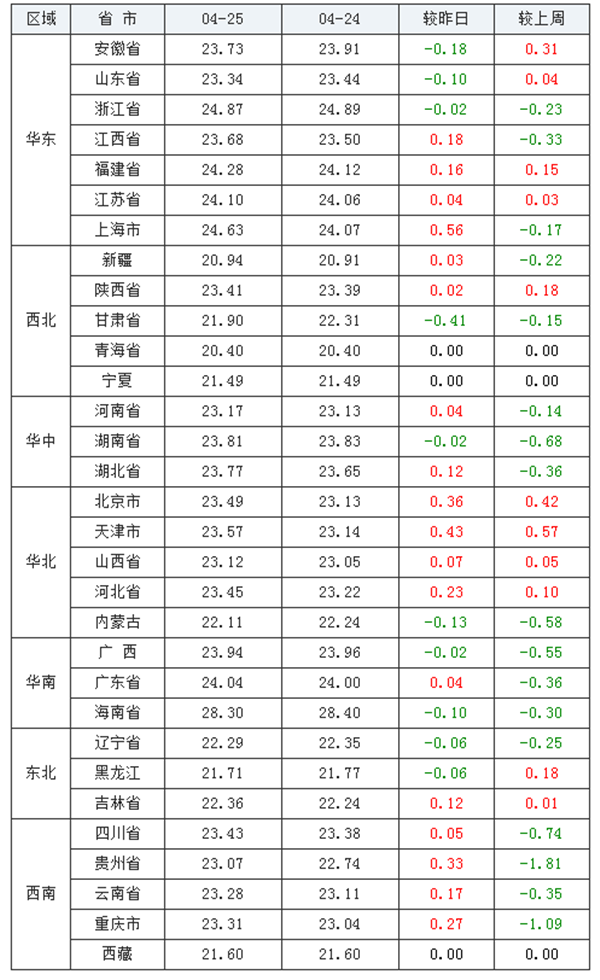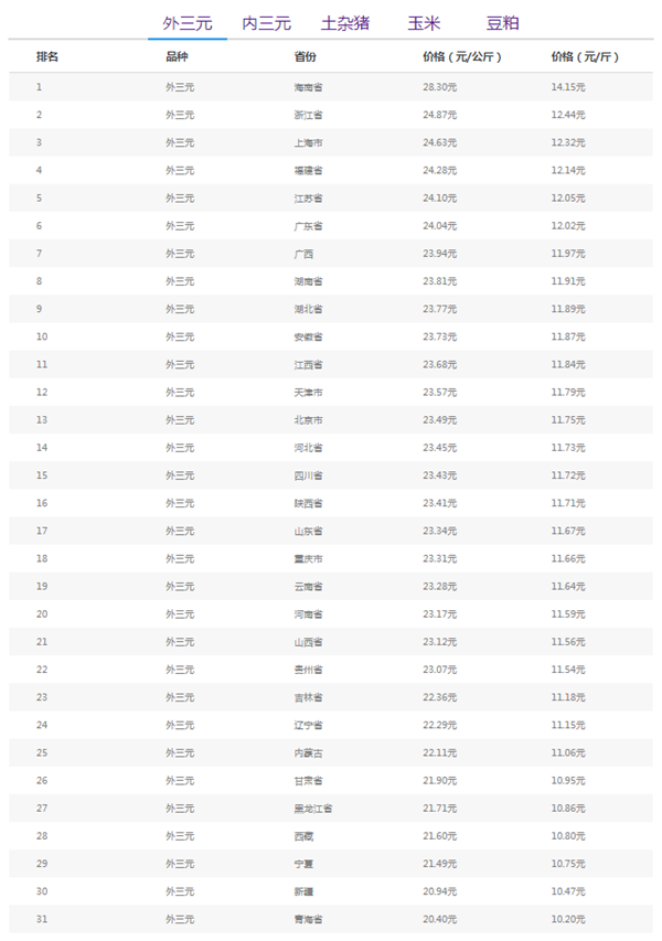 外三元排行前三:海南省28.30元/公斤、浙江省24.87元/公斤、上海市24.63元/公斤。