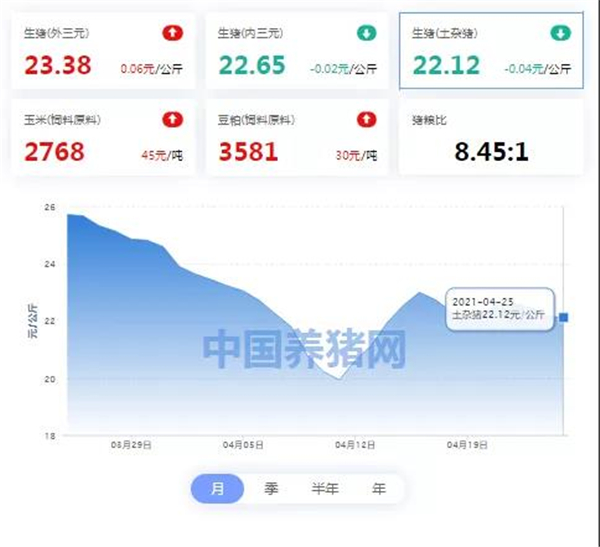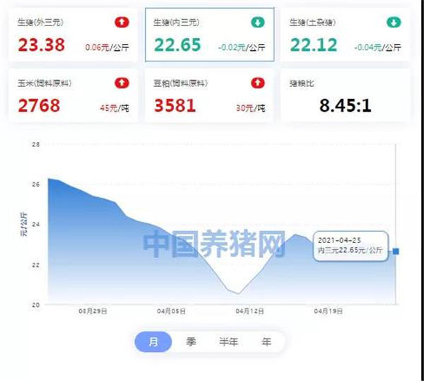 内三元)均价为22.65元/公斤,猪价较昨日下跌了0.02元/公斤,环比下跌13.78%,同比下跌29.33%;