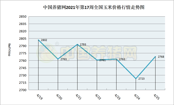 猪价系统数据监测,2021年第17周(2021年4月19日至2021年04月25日)我国玉米价格出现涨跌调整的趋势,玉米行情走势图呈现“跌-涨-跌-涨”,但是本周玉米价格整体出现回落,跌得多,涨得少。全周玉米价格区间在2723-2802元/吨,周初玉米价格为2802元/吨,周末价格为2768元/吨,全周玉米价格累计下跌了34元/吨。