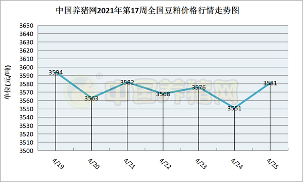 猪价系统数据监测,2021年第17周(2021年4月19日至2021年04月25日)本周豆粕价格出现“跌-涨-跌-涨”行情走势,价格较为平稳。全周豆粕价格区间在3551-3594元/吨之间,周初豆粕价格为3594元/吨,周末价格为3581元/吨,全周豆粕价格累计下跌了13元/吨。