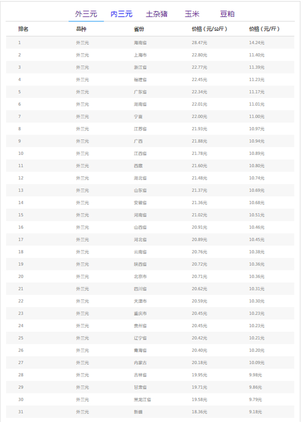 外三元排行前三:海南省28.47元/公斤、上海市22.80元/公斤、浙江省22.77元/公斤。