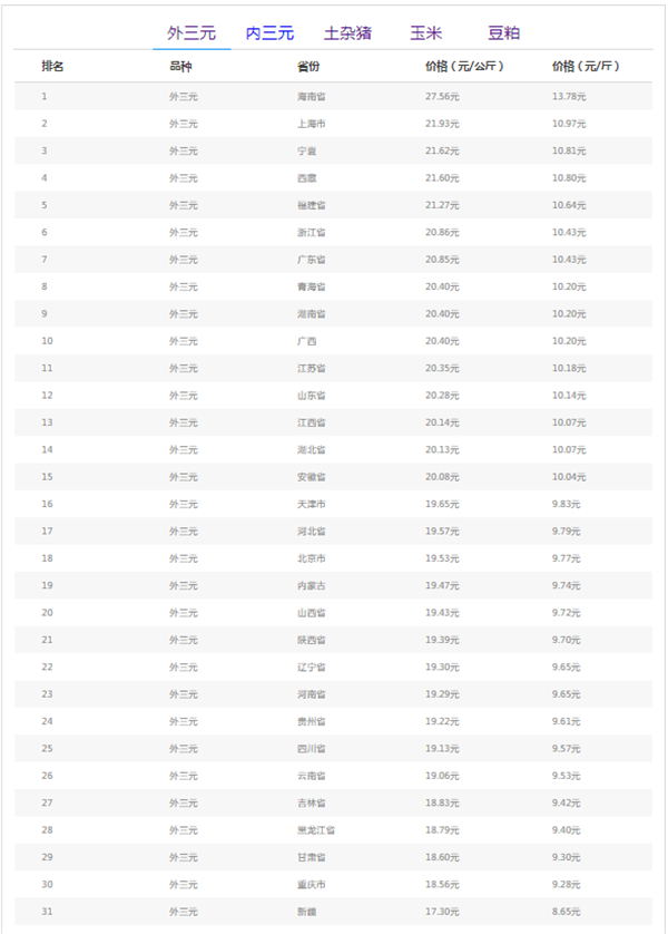 外三元排行前三:海南省27.56元/公斤、上海市21.93元/公斤、宁夏回族自治区21.62元/公斤。