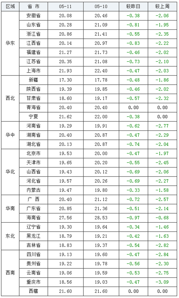 05月11日-全国外三元生猪价格走势图及涨跌表