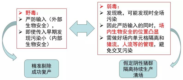 非洲猪瘟病毒野毒(强毒株)和弱毒的生物安全防控措施是类似的,但是防控的侧重点和最终的结果不同。野毒(强毒株)感染后如果能早期发现,则污染范围小;但是弱毒难以发现,发现时可能已经造成非常大的污染范围。