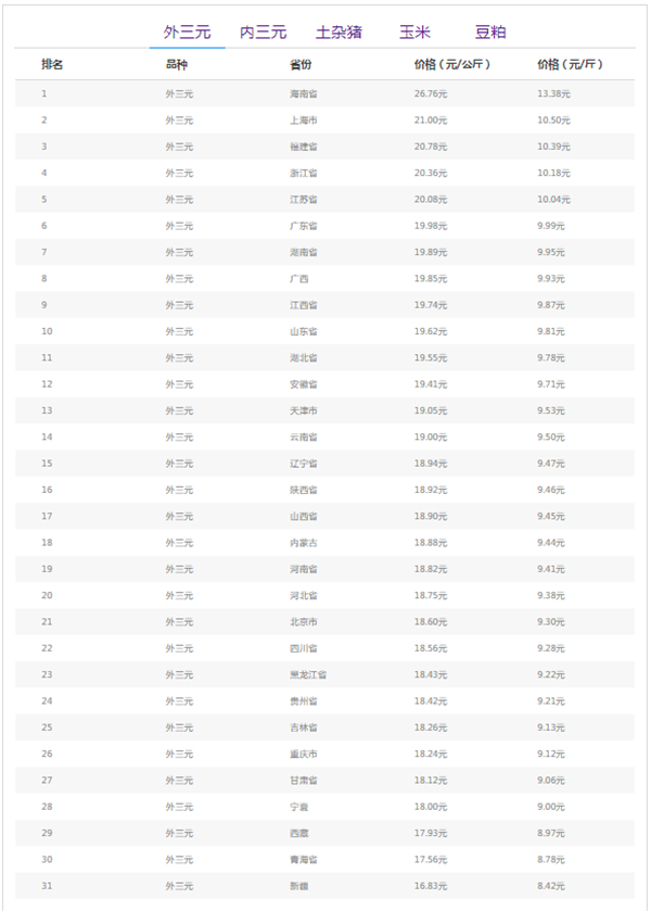 外三元排行前三:海南省26.76元/公斤、宁夏回族自治区21.62元/公斤、西藏自治区21.60元/公斤。