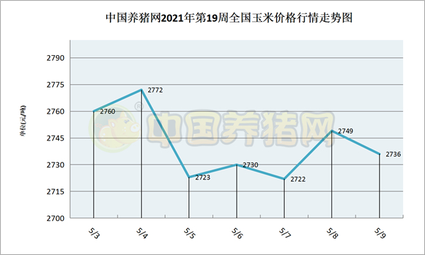 猪价系统数据监测,2021年第19周(2021年05月03日至2021年05月09日)我国玉米行情处于涨跌互现状态,总体跌得多,涨得少。全周玉米价格区间在2722-2772元/吨,周初玉米价格为2760元/吨,周末价格为2736元/吨,全周玉米价格累计下跌了24元/吨。