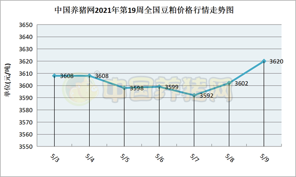 猪价系统数据监测,2021年第19周(2021年05月03日至2021年05月09日)本周豆粕价格周初略微上涨,周中价格下跌,周末行情又迎来一波上涨。全周豆粕价格区间在3592-3620元/吨之间,周初豆粕价格为3608元/吨,周末价格为3620元/吨,全周豆粕价格累计上涨了12元/吨。