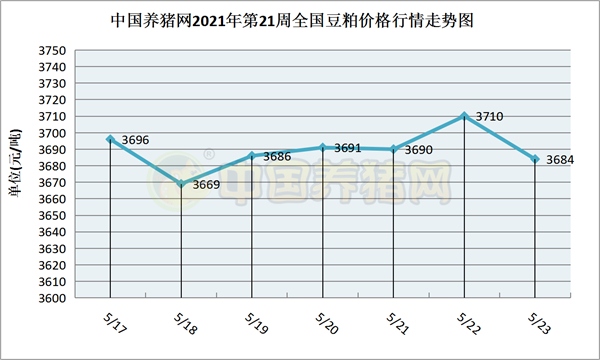 猪价系统数据监测,2021年第21周(2021年05月17日至2021年05月23日)本周豆粕价格行情走势震荡偏弱,有所下跌。全周豆粕价格区间在3669-3710元/吨之间,周初豆粕价格为3696元/吨,周末价格为3684元/吨,全周豆粕价格累计下跌了12元/吨。