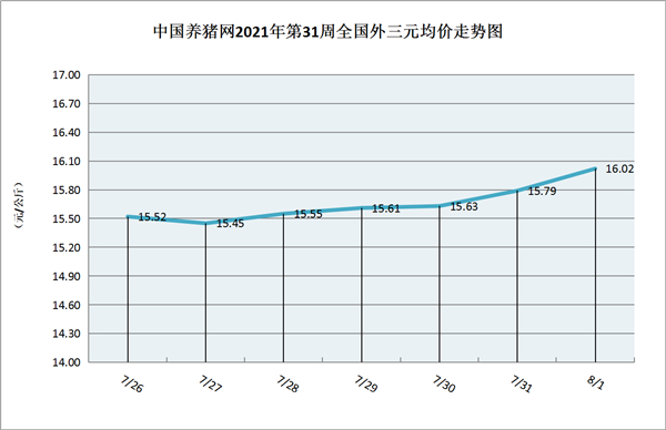 猪价系统数据监测,2021年第31周(2021年07月26日至2021年08月01日)全国外三元生猪价格走势整体呈现微幅上涨行情,周初期猪价有所下跌,周中期到周末期猪价小幅上涨。本周猪价区间在15.45-16.02元/公斤之间!周初猪价为15.52元/公斤,周末猪价为16.02元/公斤,全周猪价累计上涨了0.50元/公斤。