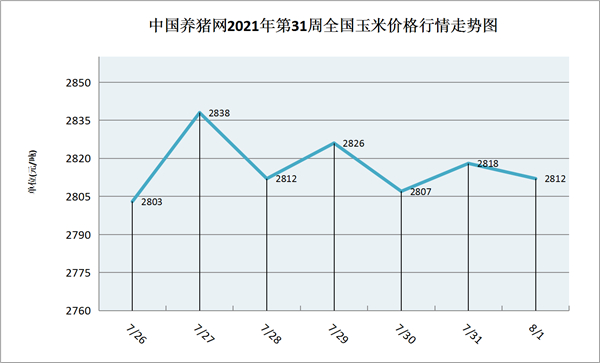 猪价系统数据监测,2021年第31周(2021年07月26日至2021年08月01日)本周我国玉米价格整体有所回落,但幅度不大,以涨跌互现为主。全周玉米价格区间在2803-2838元/吨,周初期玉米价格为2803元/吨,周末期价格为2812元/吨,全周玉米价格累计下跌了9元/吨。