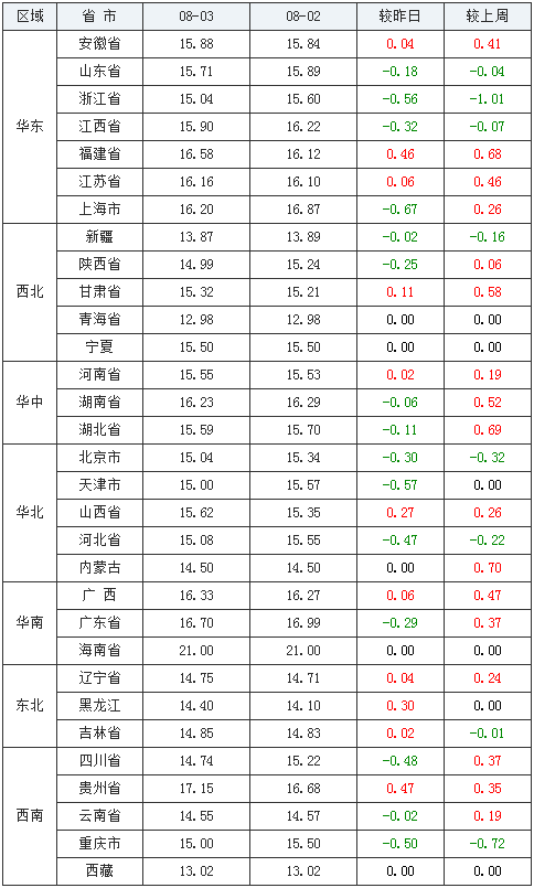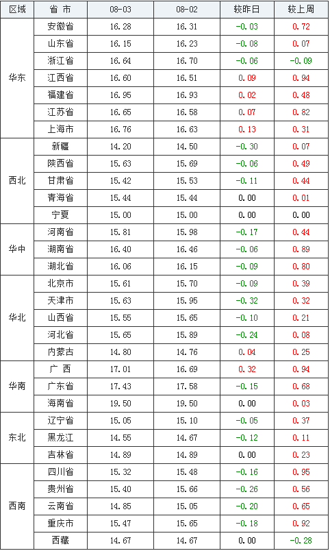 猪价下跌地区(20个):山东省、安徽省、浙江省、新疆维吾尔自治区、陕西省、甘肃省、河南省、湖南省、湖北省、北京市、天津市、山西省、河北省、广东省、辽宁省、黑龙江省、吉林省、贵州省、云南省、重庆市;猪价跌势区间为0.03-0.32元/公斤。