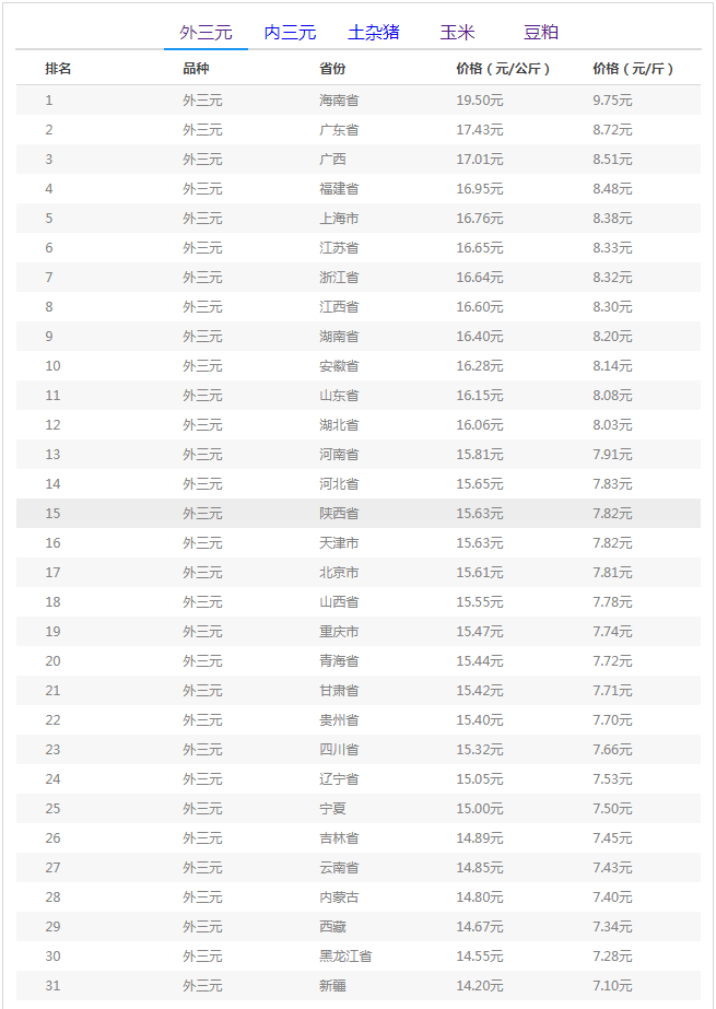 外三元排行前三:海南省19.50元/公斤、广东省17.43元/公斤、广西壮族自治区17.01元/公斤。