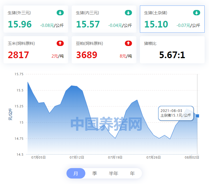 全国(生猪品种:土杂猪)均价为15.10元/公斤,猪价较昨日下跌了0.07元/公斤,环比下跌3.39%,同比下跌58.83%;