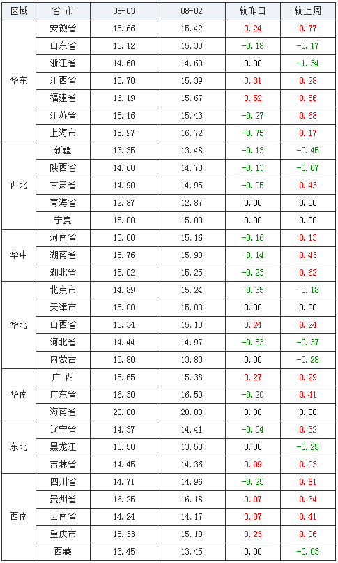 外三元排行后三:新疆维吾尔自治区14.20元/公斤、黑龙江省14.55元/公斤、西藏自治区14.67元/公斤。