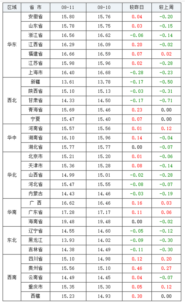 相较昨日(2021年08月10日)15.57元/公斤,价格上涨0.03/公斤;