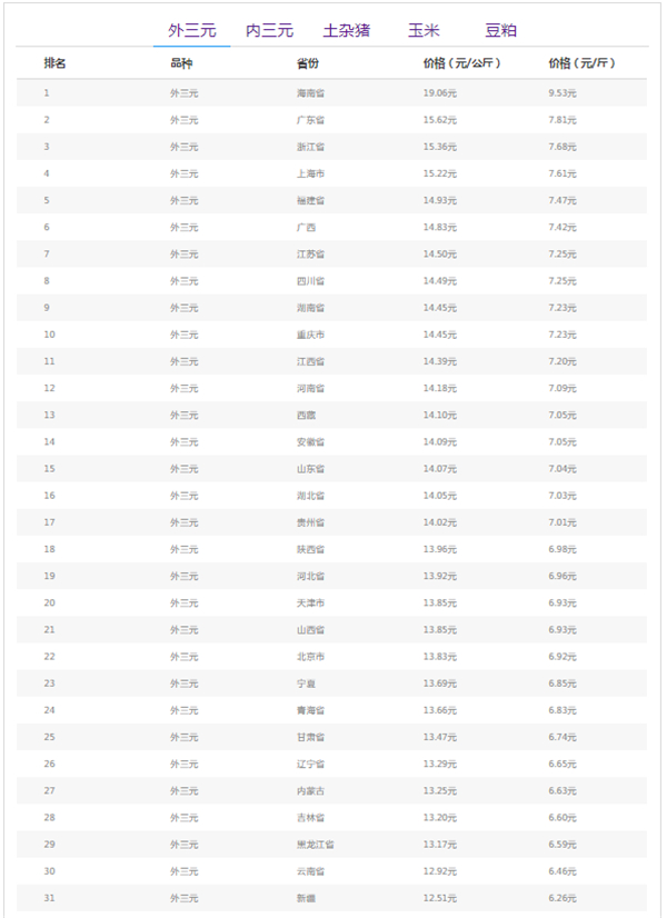 外三元排行前三:海南省19.06元/公斤、广东省15.62元/公斤、浙江省15.36元/公斤;
