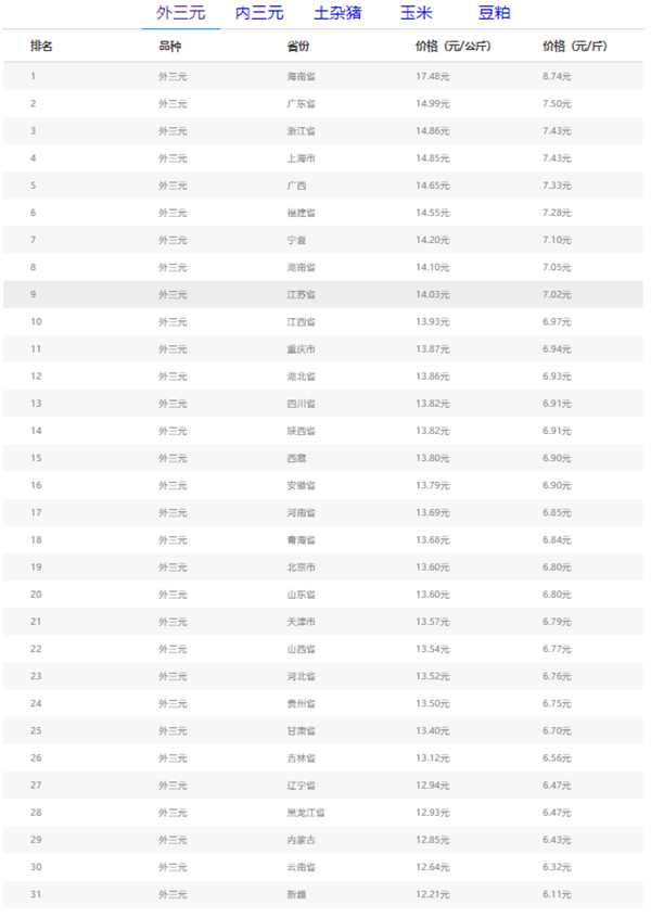 外三元排行前三:海南省17.48元/公斤、广东省14.99元/公斤、浙江省14.86元/公斤;