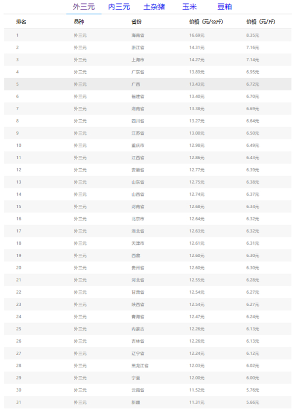外三元排行前三:海南省16.69元/公斤、浙江省14.31元/公斤、上海市14.27元/公斤;