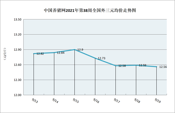 猪价系统数据监测,2021年第38周(2021年9月13日至2021年9月19日)全国外三元生猪价格走势整体呈现小幅下跌趋势,周中猪价震荡上涨,周末猪价呈现下跌。本周猪价区间在12.56-12.90元/公斤之间!周初猪价为12.82元/公斤,周末猪价为12.56元/公斤,全周猪价下跌了0.26元/公斤。