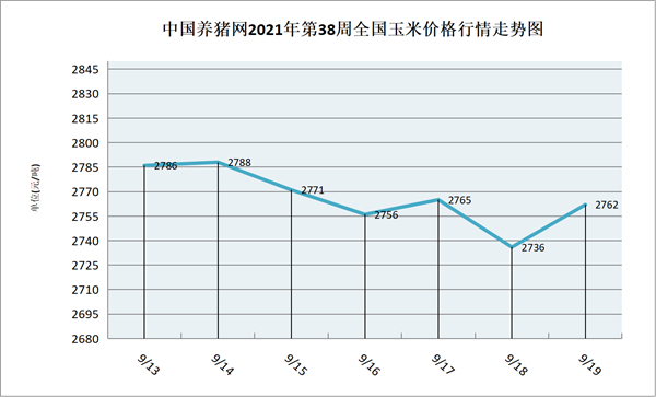 猪价系统数据监测,2021年第38周(2021年9月13日至2021年9月19日)本周我国玉米价格整体以小幅下跌为主。玉米价格先小幅上涨后又下跌,周中和周末又震荡调整。全周玉米价格区间在2736-2788元/吨,周初期玉米价格为2786元/吨,周末期价格为2762元/吨,全周玉米价格累计上下跌了24元/吨。